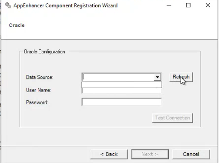When attempting to add an existing Oracle database to component registration wizard, the Data Source drop down field is empty and never populates any Oracle database.