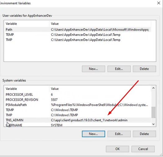 - TNS_ADMIN - This should be pointing to the directory where the tnsnames.ora file is located. For example:
