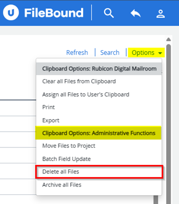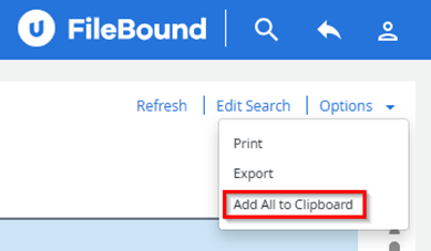 FileBound search results are limited to 25 items per page. To perform actions on all returned files at once, you can move them to the Clipboard, which allows bulk operations beyond the 25‑item limit.