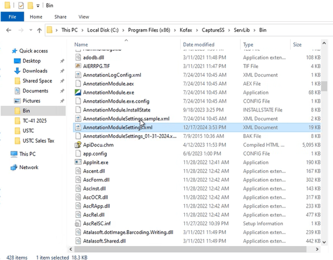 1. Open the AnnotationModuleSettings.xml found in the Program Files (x86)\Kofax\CaptureSS\ServerLib\Bin\ folder.