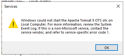 The Apache Tomcat 9 OTS ots service terminated with the following service-specific error: Incorrect function.